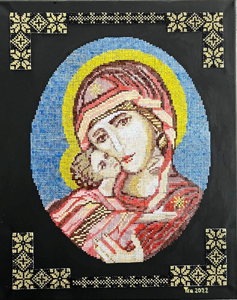 de broderie romaneasca, cusute manual, cu elemente arhitecturale si mozaic.